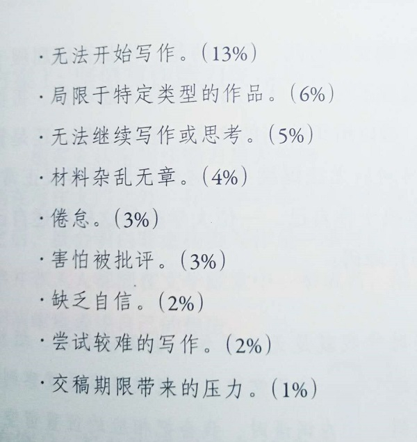 书中对于“写作障碍”的描述就像一个个恐怖故事,比如这句:“如果暂时性写作障碍转化成了永久性写作障碍,也许职业作家只能转行。业余作者写作障碍的影响,可能连他自己也较难察觉。”