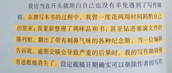 言归正传。这本书最有意思也最聪明的一点便是一开始就正面“写作障碍”这个问题。作者也是可爱得紧,一上来便承认自己写这本书时也遇到了写作障碍,最后是编辑告知逾期会带来严重后果,她才进入写作状态的。
