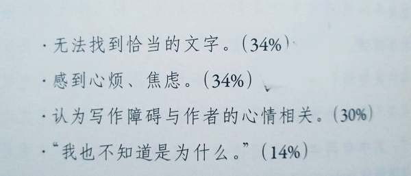 作者的调查问卷显示,75%的职业作家和业余作者遇到过写作障碍,25%的人从未经历过。但总体来说同是否是职业作家无关,似乎和性格有关,“也就是说你要么会遇到写作障碍,要么不会。”