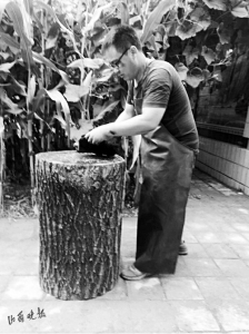 在“上党碧松烟”的制墨作坊,山西晚报记者看到,李云步把经过挑选的松根送进炉子,经过燃烧,数百斤的松根最终化为几斤漆黑的松烟粉灰。这些松烟粉灰将被拿到制墨作坊等待加工。上党“碧松烟”墨锭制法有十多道工序。“先和料,再把皮胶用文火慢熬。熬软取出,将油烟、麝香、冰片等料依次按量加入,置于铁皮上用大杵反复捶敲无数次,敲成纸一般薄,再折回来捶敲,如此循环往复。烟料和胶料细腻均匀地糅合在一起,坯料就形成了。这道工序没有千锤百炼,是出不来好活的。”李云步边捶边谈,“墨坯捣好搓条压入木质墨模定型,取出后阴干整形,在墨锭上描金,再包装。”