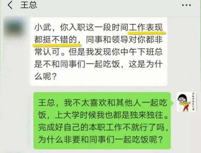 半个多月前的某天早上,小武突然收到一条微信,领导找小武谈话,称其工作表现不错,不过同时也指出她“不合群”,原因是小武中午不跟同事们一起吃饭。
