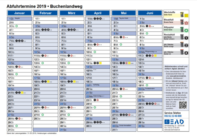 德国人向来以守秩序著称。不仅是上班族,老老小小都随身带着自己的秩序手册,每一个日程安排都清清楚楚。而垃圾同样有垃圾日历,在德国居住都少不了它。垃圾日历是每个地方市政给居民发放的本年度垃圾清运时间安排表,发放到每一户,也可以在网上查询或下载。笔者查看了自己住过的达姆施塔特榉原路今年的垃圾日历,纸质版正面是这样的(反面是下半年):
