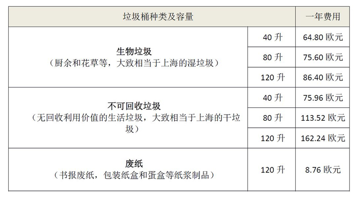 首先算经济账。德国居民投放垃圾(相当于上海的干垃圾和湿垃圾)均需付费。由居民或物业到市政垃圾清运公司开户,按垃圾种类、垃圾桶容量和清运次数支付费用。这里从德国北部城市基尔2019年的垃圾清运价目表中选取一些内容为例: