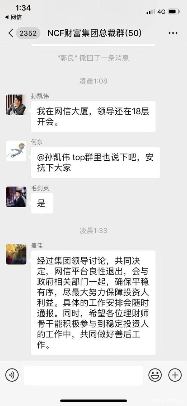 7月4日,一张带有网信集团前执行董事及CEO盛佳聊天记录的图片流传开来,显示盛佳于凌晨1时33分确认了网信普惠平台将良性退出P2P网贷业务的消息。网信普惠为网信集团旗下的网贷平台,而网信集团则是先锋集团旗下的一家综合金融科技服务集团。