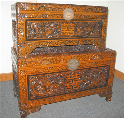 果喜雕花樟木箱