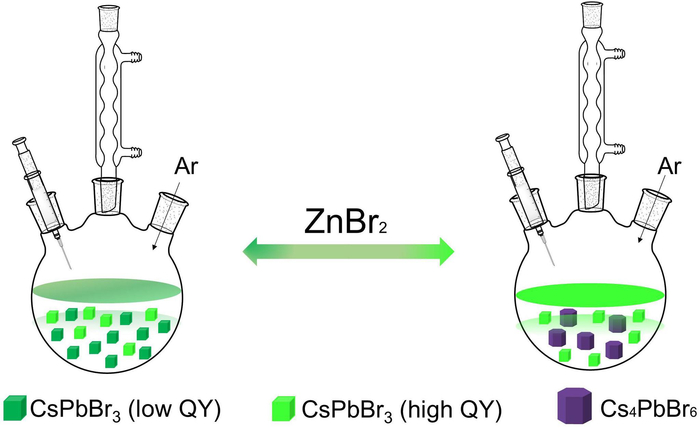 在ZnBr2诱导剂作用下CsPbBr3和Cs4PbBr6钙钛矿纳米晶结构转换的示意图