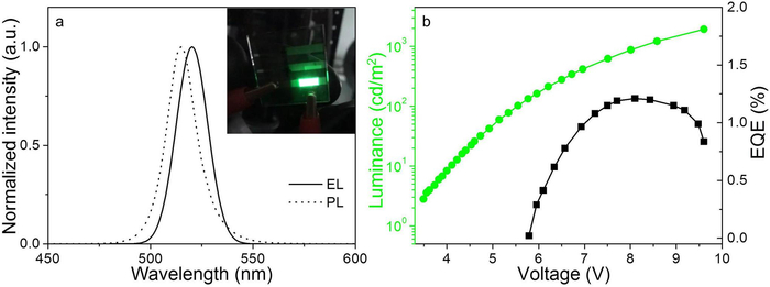 (a)钙钛矿量子点做成LED器件前后的荧光发射光谱和器件照片结果(b)LED器件的亮度和外量子效率结果