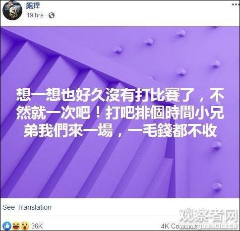 不过待到3日,陈之汉突然在脸书直播中“自降身价”,把单挑价码价降至500万新台币(约合110万人民币,16万美元)。随后,他再度更新脸书,表示算了一毛钱都不收了。因为他考虑了一下,“只想要好好打一个比赛,我也这么多年没有打了,打赢打输不重要,好玩就好。”