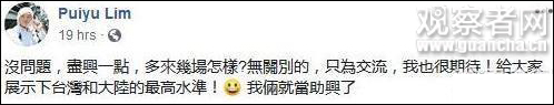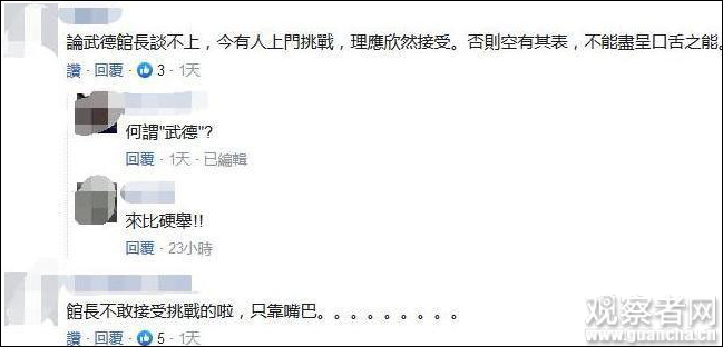 见“馆长”没有回应,练喻轩通过脸书继续喊话:“你到底有没有胆子啊?虽然你水平很差,但我会给你机会哦!”