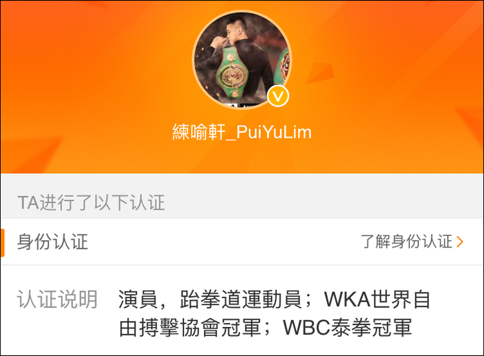 对不关心相关项目的网友来说,练喻轩这个名字也许有些陌生。练喻轩1989年出生于山东淄博,身高1.8米,体重73公斤,微博认证为“演员、跆拳道运动员、WKA世界自由搏击协会冠军、WBC(世界拳击理事会)泰拳冠军”,有WBC泰拳钻石金腰带和WBC拳击亚洲金腰带加身。