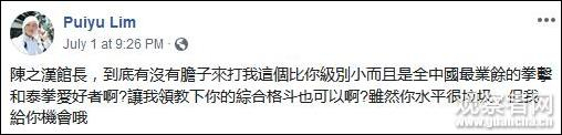 7月1日晚,练喻轩Youtube上发布了一段1分钟的视频,隔空“约战陈之汉: