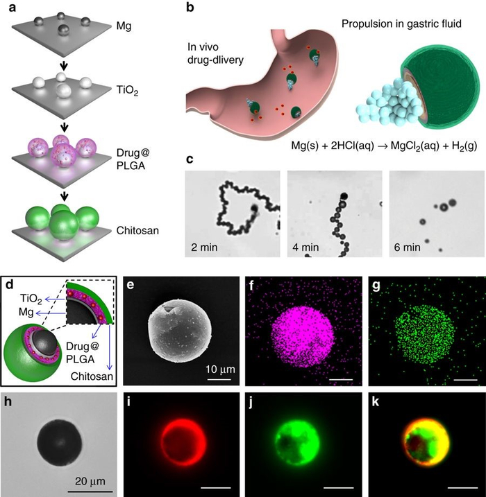 动物实验中,他们在患有胃感染的小鼠胃部置入重两毫克、数量约为十万个的镁球机器人。进入胃部之后,镁与胃酸通过化学反应产生氢气泡,推动镁球机器人运动。由于镁球外层的聚合物具有疏水性,机器人更容易吸附在胃壁上。吸附之后,聚合物在胃壁上逐渐溶解,缓慢释放出混合在其中的抗生素来治疗感染。