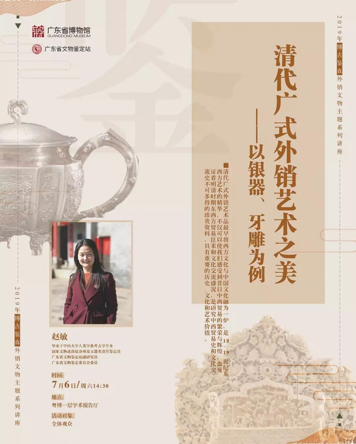 本次讲座旨在通过外销银器、外销牙雕等清代外销艺术品的分析,与听众分享交流清代广式外销艺术品的造型、装饰与审美等特征,借以增强大家对于本土历史文化的了解,进一步弘扬本地优秀的历史文化遗产,增强我们的文化自信。