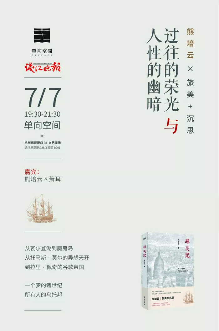 7月7日晚,熊培云将携新书《寻美记》做客单向空间·杭州乐堤港店,分享他的旅美经历与思考,聊聊过往的荣光与人性的幽暗。