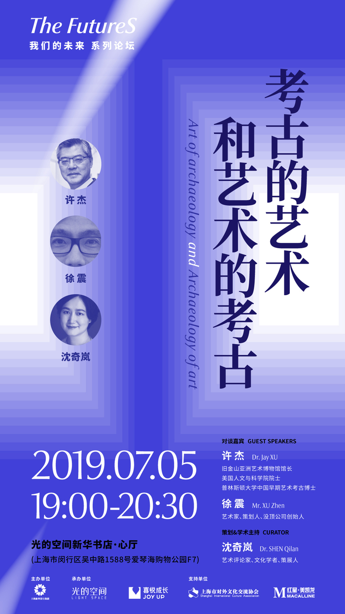 在这个拥有前所未有的复杂性和惊人能量的时代里,不止一个未来正在降临,我们该如何选择?我们将去往哪里?当科技与经济已经成为这个时代的基本维度时,艺术和哲学又该如何言说?人文之道,何以成为当下的精神资源和未来的灵感启迪?对于这些问题的追问,我们开启了“The FutureS·我们的未来”系列论坛。第一场论坛“考古的艺术和艺术的考古”于2019年7月5日在光的空间·新华书店举行。首场论坛邀请了旧金山亚洲艺术博物馆馆长许杰与艺术家徐震作为嘉宾,由策展人、艺术评论家沈奇岚担任策划和学术主持,畅谈考古与当代艺术之间的火花。