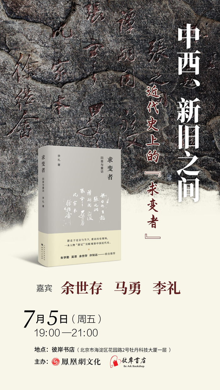 7月5日,资深媒体人、《东方历史评论》执行主编李礼携其新著《求变者:回首与重访》做客彼岸书店。同时,本次活动还邀请到著名文化学者余世存、中科院近代史研究所研究员马勇,三位嘉宾将围绕本书内容展开对话,共同展开一场别开生面的中国近代史之旅。