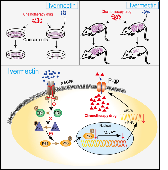 在作用机理的探索方面,伍一军研究组通过Co-IP和Octet RED96 system测定,首次发现伊维菌素可以与人EGFR胞外段直接结合发挥其逆转效应,同时采用luciferase reporter assay和ChIP assay等实验方法证明伊维菌素的作用机制是通过抑制EGFR及下游ERK/Akt/NF-κB信号通路直接下调多药耐药蛋白P-糖蛋白的表达而逆转耐药(参见附图)。
