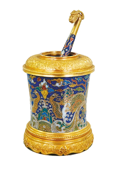掐丝珐琅色彩绚烂,最为华丽。清宫旧藏的掐丝珐琅双龙纹水盂,制作于清乾隆年间,高9.1厘米,口径3厘米。水盂敛口,直壁,平底,圈足。腹壁以宝蓝色釉为地,采用红、黄、绿、蓝、白等色珐琅釉,装饰海水江崖云龙纹,双龙相对处有一“万”字结。整幅图案寓意江山万代。器口、底及圈足鎏金,口部以莲纹为间隔,錾刻五只形态各异的凤鸟。足沿錾刻缠枝莲纹,外底长方框内有“大清乾隆年制”阳文楷书款,框外浮雕双龙环抱。水盂内还有一铜鎏金掐丝珐琅釉龙首匙,与水盂相得益彰,惟妙惟肖。