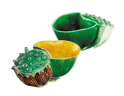 拍场上的精品像生形水盂也有几万元的,但仍不失水准。2013年6月,北京匡时上拍了一对清康熙仿生瓷莲蓬水盂,最终以2.53万元成交。该水盂利用绿釉、黄釉、白釉仿生莲蓬的效果,写实逼真,表皮褶皱具有天然肌理质感,莲蓬的顶部凸雕十五颗果实饱满的莲子,随意而富有情趣。该像生形水盂结合了实用性与趣味性,充分体现了作者富有生活情趣的艺术创造力,成对保存至今,颇为难得。