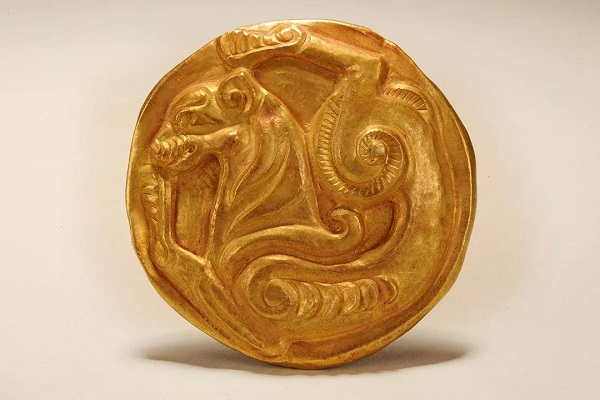 展览中就展出了虎纹金牌,1977年出土于乌鲁木齐县南山矿区阿拉沟30号古墓,同墓出土8件。圆形,纹样基本相似,利用金片捶揲出浮雕纹样。躯体反转呈圆形,头高昂,前爪抬至颌下,后爪至脑后,极富动感。对虎纹金带饰(长25.4、宽3.3厘米),是镶嵌于皮状物上的装饰品。纹样系捶揲加工,两虎相对,虎视眈眈,欲作争斗状。动物纹是北方草原常见的一种纹样风格,分布的相当广泛。