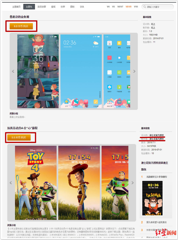 除了来自《悬崖上的金鱼姬》,小米商店主题包显示的前100款主题中,还出现了“玩具总动员4-全‘心’旅程”“唐老鸭唐老鸭85周年-快乐冲鸭”等主题包,两者均为标价售卖,但在其基本信息中,设计师和制作者均表示为“迪士尼官方授权”。