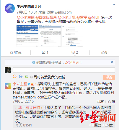7月7日上午10时许,红星新闻记者就此致电小米公关,对方没有给予任何回应。下午1时37分,@小米主题 在微博发表声明称,在发现相关反馈信息后,第一时间对所有现有主题作品进行仔细排查,发现确实存在网友反映的个别情况,系第三方作者自主上传行为。