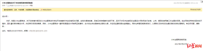 @EPcat 向红星新闻提供了当时小米发送的回复函。小米主题商店版权组于2017年7月27日回复称,经紧急核查后,已将存疑素材全部下架,且对涉及未经授权的主题设计师账号进行权限。