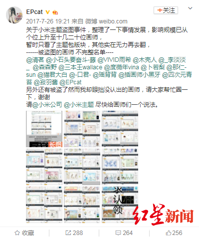 2019年7月7日,曾参与维权的画师@EPcat 告诉红星新闻,因为当时牵扯到的画师很多,小米方面很快私下邮件联系了她。虽然没有公开道歉,但当时平台能处理这件事情,对她来说已经“挺安慰了”。
