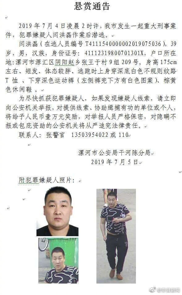 悬赏通告信息显示,闫洪磊,39岁,男,汉族,身份证号:41112319800701301X,户口所在地:漯河市源汇区阴阳赵乡张王于村9组209号, 身高175cm左右、短发、体态较胖、逃跑时上身穿深底白色不规则纹路T恤 、下穿深色运动裤(左侧裤兜下方有白色图案)、棕黄色休闲鞋。