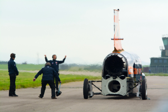 2017年10月26日,英国纽基,由皇家空军联队(Royal Air Force Wing)指挥官安迪·格林(Andy Green)驾驶的“猎犬”超音速汽车在当地机场进行测试。该车的实验目标是在2019年打破目前的陆地最快速度世界纪录。视觉中国供图(资料图片)