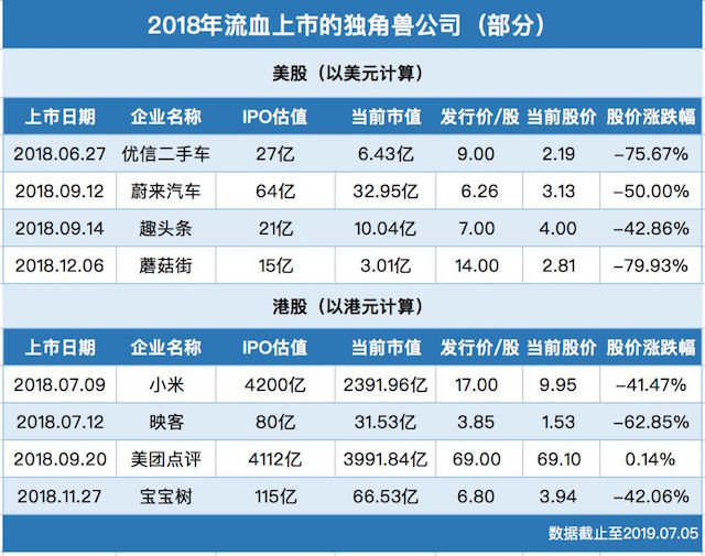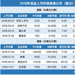不止是小米,2018年赴美股、港股上市的大部分独角兽企业,市值和股价都经历了大幅缩水。像优信二手车、蔚来汽车、蘑菇街、映客等企业目前的股价,都已经比发行价下跌了50%以上。