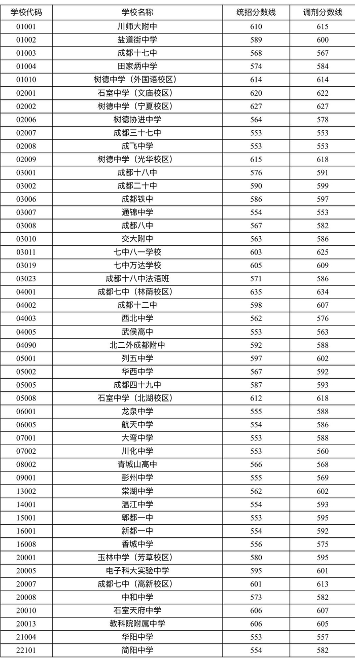 本批次只对调档分在553分及以上的考生进行投档、录取,所产生的学校分数线是指该校在本批次录取到的考生中最低分,其中龙泉中学、航天中学、大弯中学、川化中学、青城山高中、彭州中学、棠湖中学、温江中学、郫都一中、新都一中、香城中学、简阳中学的分数线是指学校在本批次面向“5+2”区域录取的考生中最低分。