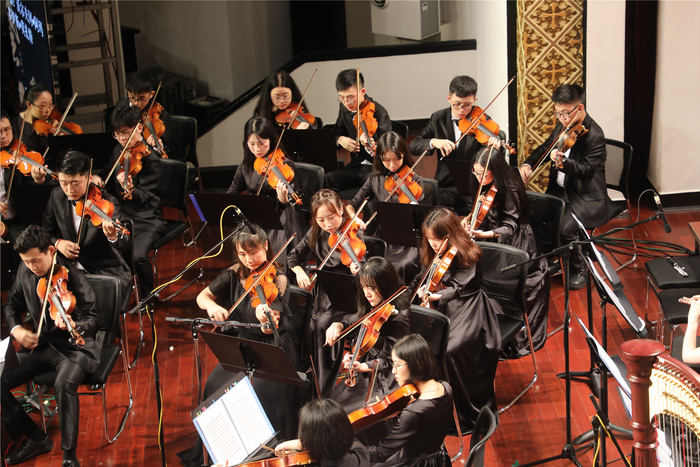 大学生交响乐团于2019年3月成立,是由热爱艺术、具有艺术特长的非艺术类在校大学生组成,团员是来自17个学院24个专业的学生,由学校艺术教育中心负责艺术指导,组织同学们利用课余时间,开展教学和排练工作。四个月的时间打造出校园文化大餐。本次演出由大学生合唱团担任合唱,大学生舞蹈团、民乐团、键盘团的团员承担幕后工作。
