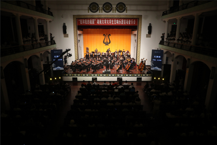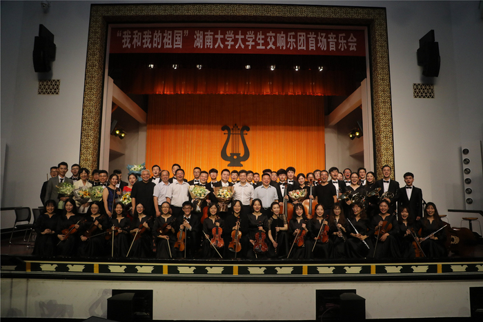 7月7日晚,“我和我的祖国”湖南大学大学生交响乐团首场音乐会在大礼堂举行,湖大学子用交响乐庆祝新中国成立70周年。音乐会由大学生交响乐团艺术总监、常任指挥、旅美青年指挥家吴博担任指挥,旅美小提琴家周雨平担任乐团首席,特邀演唱嘉宾有艺术教育中心教师王美虹及大学生艺术团团员2009届工管院校友张鲁沙、2007届工管院校友杨雪。中央电视台新闻中心记者、新闻院2004届校友丛威娜和澳大利悉尼科技大学体育新闻学博士(在读)、电气院2004届校友肖懿训担任主持。