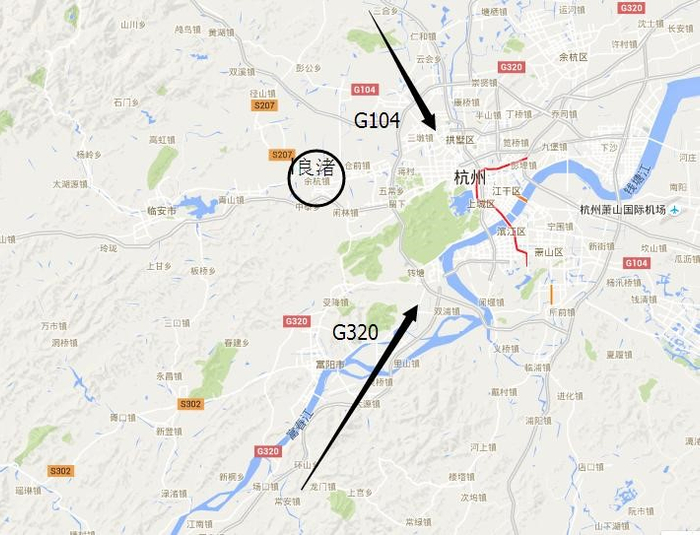 让我们跃出有限的平面地图,从更为立体的卫星地图,来审视良渚古城的位置。从卫星地图可见,今天G320国道(从云南瑞丽到上海)和G104国道(从北京开始,经过安徽到福州)在“良渚古城”所属的杭州湾平原相交。前者沿着钱塘江上游的富春江河谷,可以穿过浙西山地,进入江西、湖南等广义的南方,接入云贵高原。后者过江北后穿越皖、豫。这两条路线,在今天分别代表了从整个“南方”腹地和“北方”秦岭-淮河一线,两种人力、物力的流动方向。