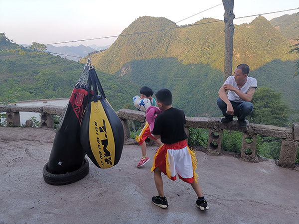 郑为新决心教他们练拳,强身健体,保护自己。第一天,让他们打家里的苞谷袋,两人觉得挺好玩。之后跳绳、做俯卧撑,练体力。