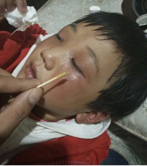 小汤圆眼睛被打肿,郑为新给她擦药。受访者 供图