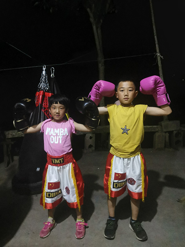 兄妹两一开始觉得练拳没啥用、又累,不想练。奶奶也心疼,说别练了吧。郑为新鼓励他们坚持下去,“训练不严格,到擂台上只有挨打的份了”,练一个月左右,有一次小汤圆把哥哥打败了,特别开心,觉得“好玩”。