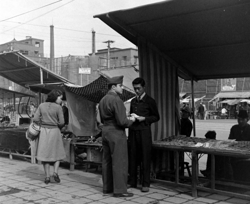 在二战前后,日本政府对粮食和生活必需品都有着严格的管控,为了满足对生活物资的需求,黑泽明所说的“黑市”开始急剧增加,并且多集中在电车铁路枢纽处,安德利尔在书中描述这类黑市:“人们前往市集,有的用近乎勒索的方式购买食品,有的以物易物,有的则偷鸡摸狗、顺手牵羊。”这个重现黑市的构想背后,其实隐藏着黑泽明对日本战后社会现状的关照,这也是作为无法化约的时空维度的第二层体现。