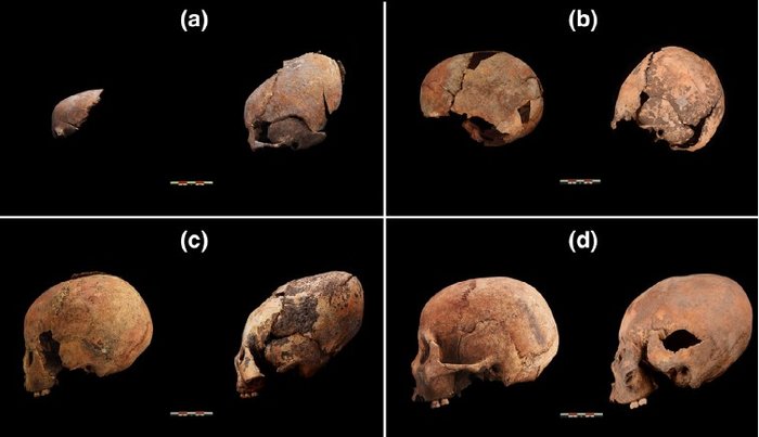 人工变形颅骨与未经人工变形颅骨的比较。(a)3岁;(b)约7岁;(c)约8岁;(d)约15岁。每张图的右侧是经过人工变形的颅骨。