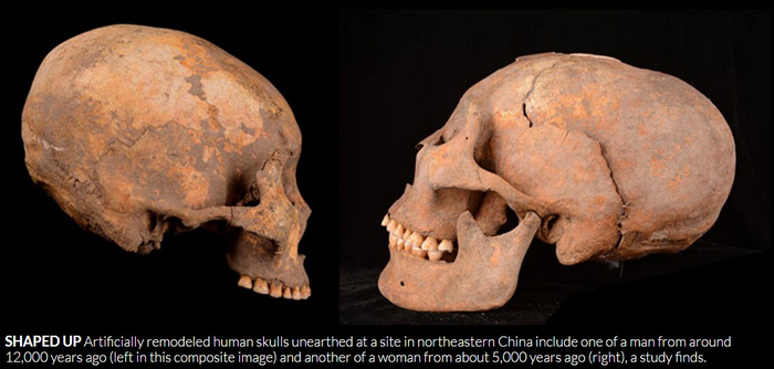 2011年至2015年,吉林大学考古团队对吉林省大安市的后套木嘎遗址进行发掘。在后续研究中,他们发现了11例经过人工变形的颅骨,颅骨被人为拉长,前后头部被压扁。这11例个体的死亡年龄在3至40岁之间。放射性测定年代技术显示,这当中,最早的头骨距今约有12000年历史,最晚的距今约5000年,两者跨度达7000年之久。