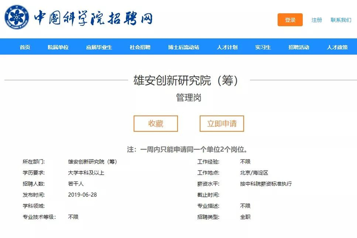 该招聘信息介绍,中科院雄安创新研究院定位于统筹全院相关创新资源,建设中科院支持和参与雄安新区规划建设发展的综合集成创新平台;创新治理结构和运行机制,成为国家深化科技体制改革的试验田;推动关键技术在雄安新区落地转化,打造引领雄安新区高新技术产业发展的孵化器;聚焦重大科技问题协同攻关,建设融科研、教育、智库为一体的一流新型科研机构。据介绍,研究院筹建期间,综合事务部负责人、相关部门的主管及司机主要在雄安筹建处办公,其他人员主要在北京办事处办公。随着雄安创新研究院的建设完成,全体人员将逐步转入雄安办公。 据了解,2017年,中科院与河北省政府签署了《关于支持雄安新区规划建设和全面深化合作协议》,先后组织相关研究所和院士专家开展了大量研究工作,制定了参与雄安新区规划建设发展的目标和任务,集全院之力筹建中科院雄安创新研究院。今年6月,中科院相关负责人曾透露,中科院首批5个项目即将落户雄安新区,包括软件所新一代信息技术、地理所地理环境系统综合试验站、植物所国家植物园建设、生态环境中心白洋淀生态环境治理,以及网络信息中心计算机超算中心。