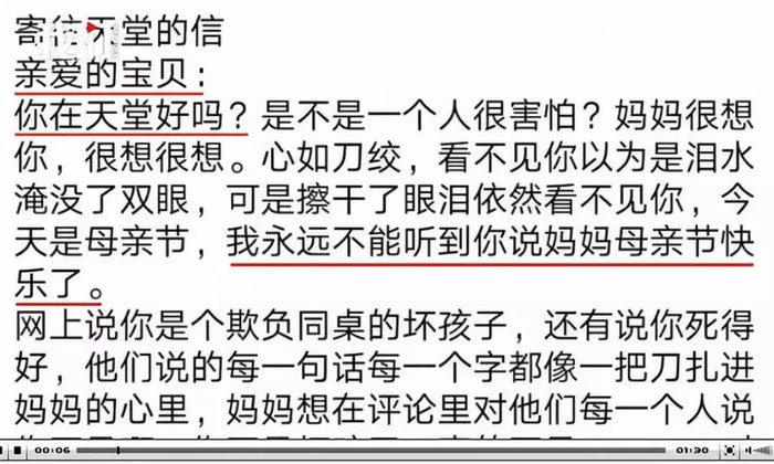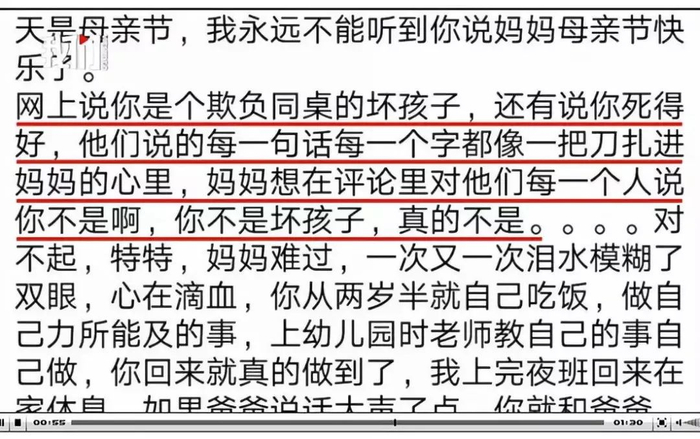 5月12日,遇害男孩妈妈发文悼念。文中写道,亲爱的宝贝,你在天堂好吗?我永远不能听到你说妈妈母亲节快乐了……网上说你是个欺负同桌的坏孩子,还有说你死得好……妈妈想在评论里对他们每一个人说你不是啊,你不是坏孩子,真的不是……妈妈是医生,救了好多人,却没有来得及救你。