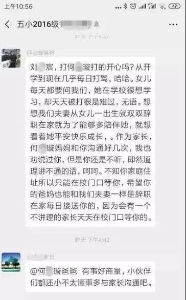 上饶五小命案发生后,一张流传甚广的聊天记录显示,在该涉事班级的家长微信群里,曾有家长质问刘某宸为什么天天打自己的女儿何某某,并表示:“既然道理讲不通,不知你家庭住址,所以只能在校门口等你,希望你的爸妈也能和我们夫妻一样是辞职在家每日接送你的,因为会有一个不讲理的家长天天在校门口等你的。”