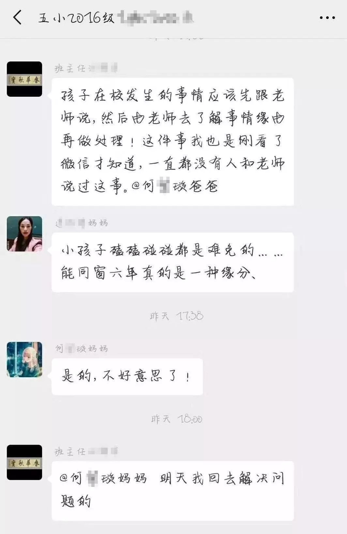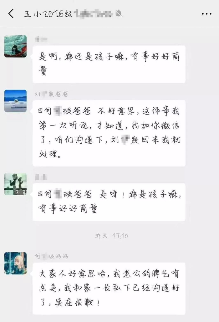 另有一张群名称相同的上述班级群聊天截图显示,群内昵称为刘某宸爸爸的群成员@何某某爸爸说:“不好意思,这件事我第一次听说……我加你微信了,咱们沟通下。”