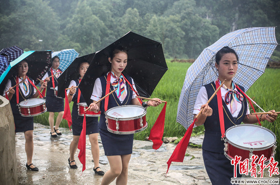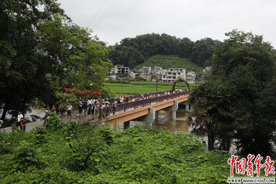 7月8日,上少寨举行新红军桥竣工和通车仪式,年轻村民组成的迎宾队伍从新桥走到旧桥迎接嘉宾。中国青年报·中国青年网见习记者 孔斯琪/摄