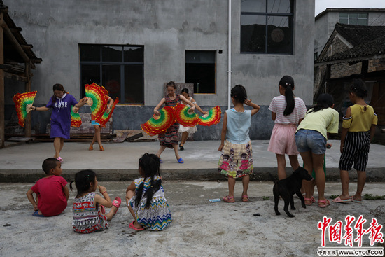 7月7日,上少寨一处新修的平台上,村里的年轻妇女加紧练习舞蹈。她们已经为第二天新桥竣工仪式上的表演准备了3个月。中国青年报·中国青年网记者 李隽辉/摄
