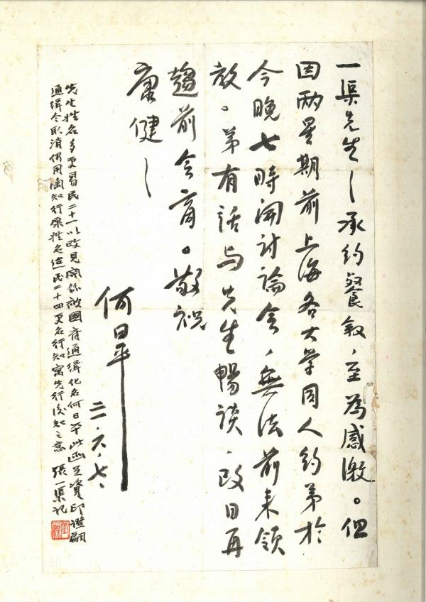 先生姓名多更易,民二十一以政见关系,被国府通缉,化名何日平,此函足资印证。嗣通缉令取消,仍用陶知行原姓名。迨民二十四,更名行知,寓先行后知之意。张一渠记。