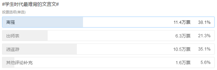 在一项超30万人的微博投票中,三篇背诵难度最大的文言文脱颖而出,分别是《离骚》《逍遥游》和《出师表》。