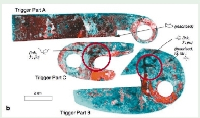 为了进一步清晰地分辨墨书的笔画,专家们采用了多光谱技术,使用多种滤镜在自然光下拍摄照片,通过计算机进行叠加处理,从而得到了青铜兵器上的墨书印迹。在一组采用多光谱技术拍摄的弩机照片上,可以清晰辨识出两个墨书“九”字,它们分布在不同的弩机部件上。